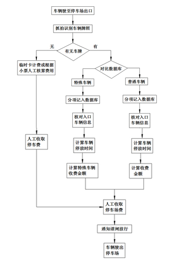 “出口系統(tǒng)”主要由ZQQM高清車牌識(shí)別設(shè)備、拍照補(bǔ)光設(shè)備、終端管理設(shè)備、數(shù)據(jù)傳輸設(shè)備及應(yīng)用軟件等組成。主要作用為記錄出口車輛的全部信息、比對(duì)車輛數(shù)據(jù)庫(kù)車輛性質(zhì)、比對(duì)入口車輛數(shù)據(jù)庫(kù)收取停車費(fèi)、內(nèi)部車輛的無(wú)障礙通行、無(wú)牌照車輛刷卡通行。